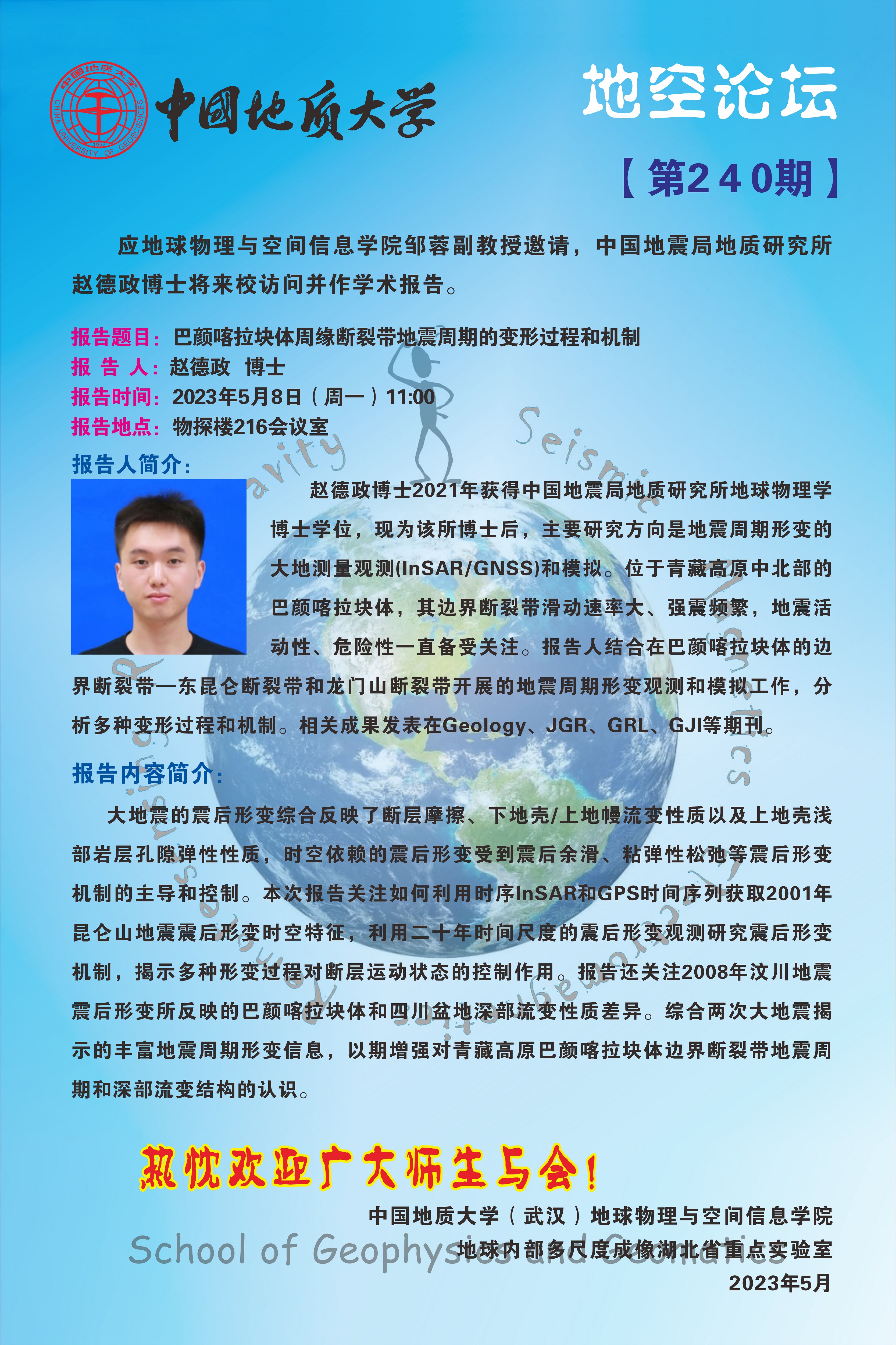 【5月8日】地空论坛:巴颜喀拉块体周缘断裂带地震周期的变形过程和机制