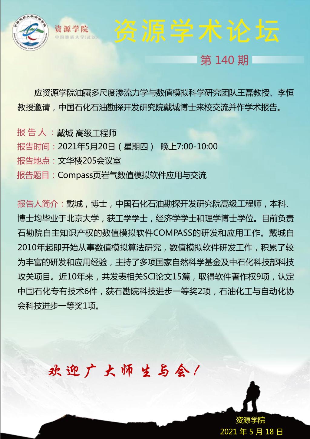【5月20日】资源学术论坛:中国石化石油勘探开发研究院戴城博士学术报告