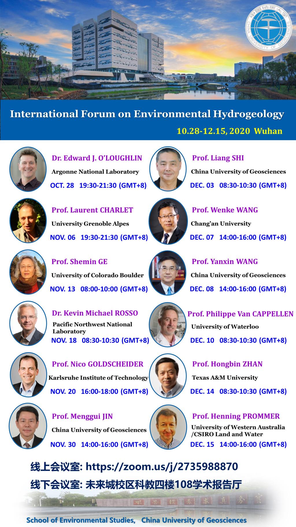 依托我校“环境水文地质”国家自然科学基金委创新群体及“111计划”高等学校学科创新引智基地,开云app登录入口(武汉)环境学院于2020年10月28日-12月15日主办国际环境水文地质论坛。本论坛面向国家战略需求和国际学术前沿,围绕地下水污染与环境修复的前沿重大科学问题,邀请国内外12位知名学者交流学术进展和科研成果,旨在发挥水文地质学核心学科作用,实现水文地质、生态水文、水文地球化学、地质微生物等多学科理论与方法的交叉融合,加强国际学术交流与合作,推动我国地下水学科及相关领域的发展。