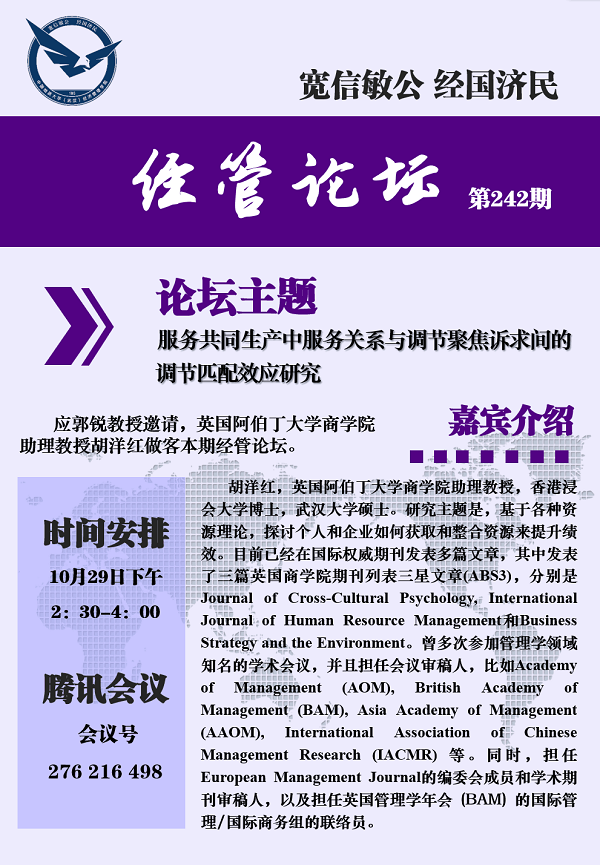【10月29日】经管论坛:英国阿伯丁大学商学院助理教授胡洋红学术报告