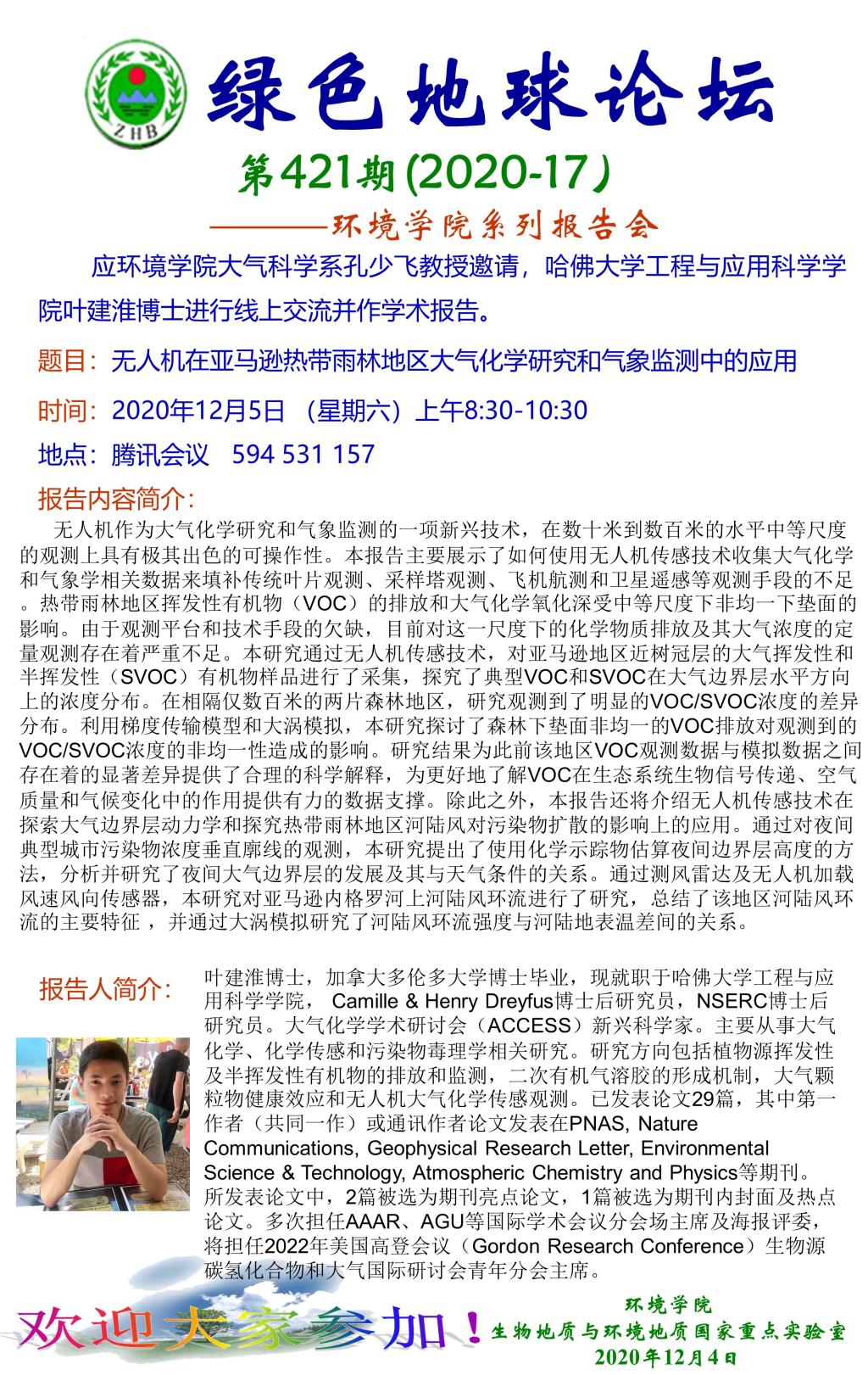 【12月5日】绿色地球论坛:哈佛大学工程与应用科学学院叶建淮博士学术报告