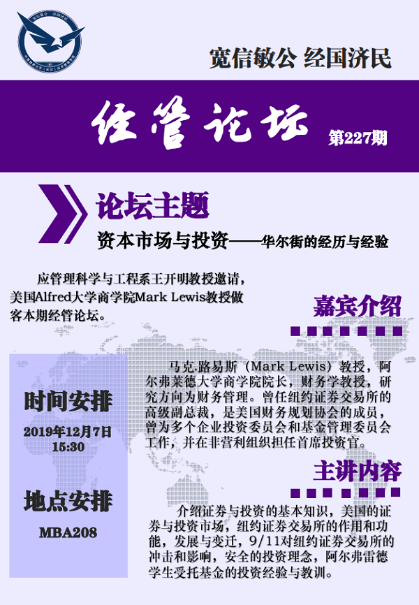 [12月7日]经管论坛:资本市场与投资——华尔街的经历与经验