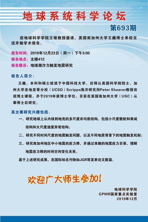 [12月23日]地球系统科学论坛:美国南加州大学王巍博士学术报告