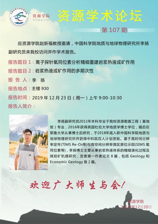 [12月23日]资源学术论坛:中国科学院地质与地球物理研究所李扬副研究员学术报告
