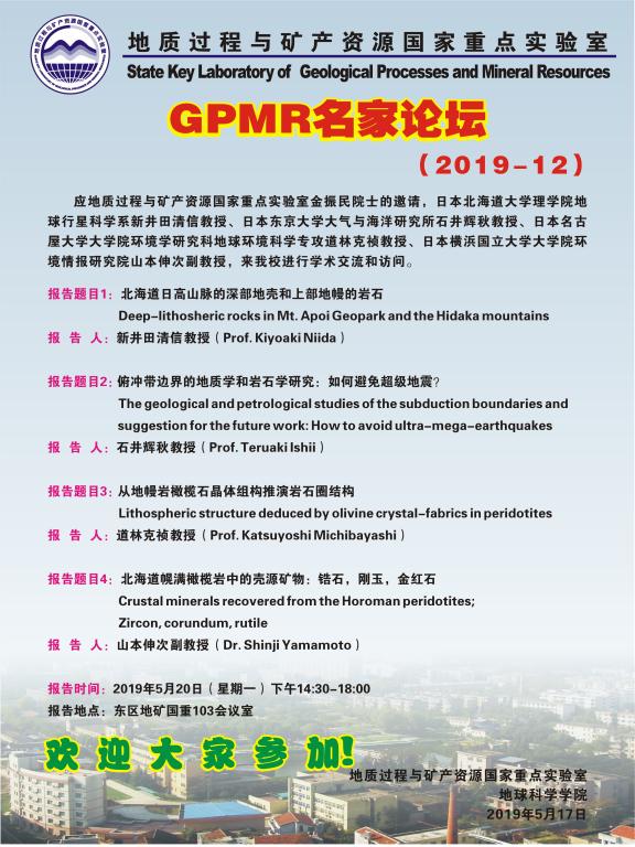 [5月20日]GPMR名家论坛:日本北海道大学理学院地球行星科学系井田清信教授、日本东京大学大气与海洋研究所石井辉秋教授、日本名古屋大学大学院环境学研究科地球环境科学专攻道林克祯教授、日本横浜国立大学大学院环境情报研究员山本伸次副教授学术报告