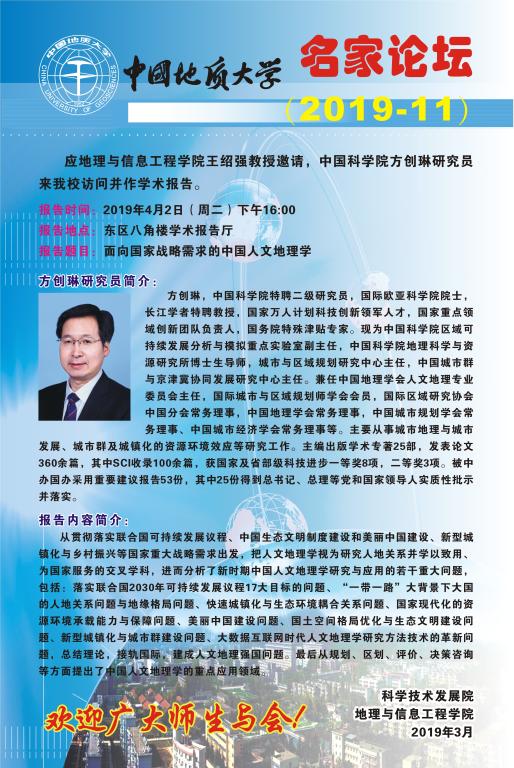 [4月2日]名家论坛:中国科学院方创琳研究员学术报告