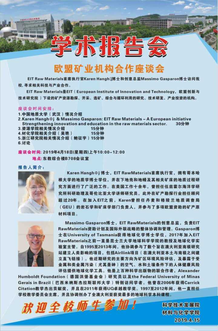 [4月18日]材化学术论坛:EIT Raw Material首席执行官Karen HanghΦj博士和创意总监Massimo Gasparon博士学术报告