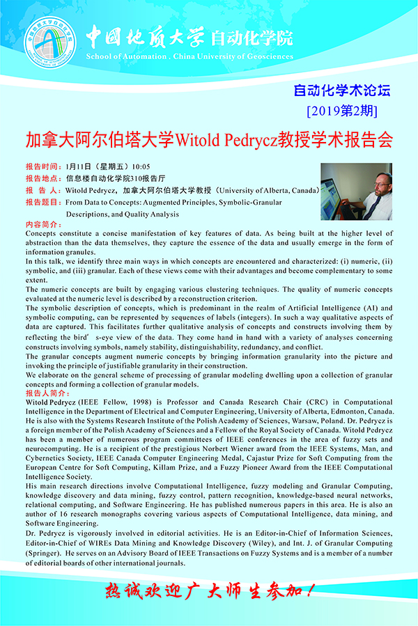 [1月11日]自动化学术论坛:加拿大阿尔伯塔大学Witold Pedrycz教授学术报告会