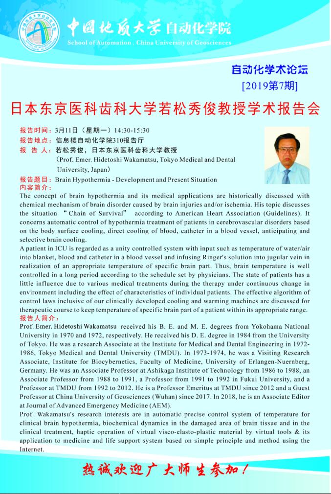 [3月11日]自动化学术论坛:日本东京医科齿科大学若松秀教授学术报告
