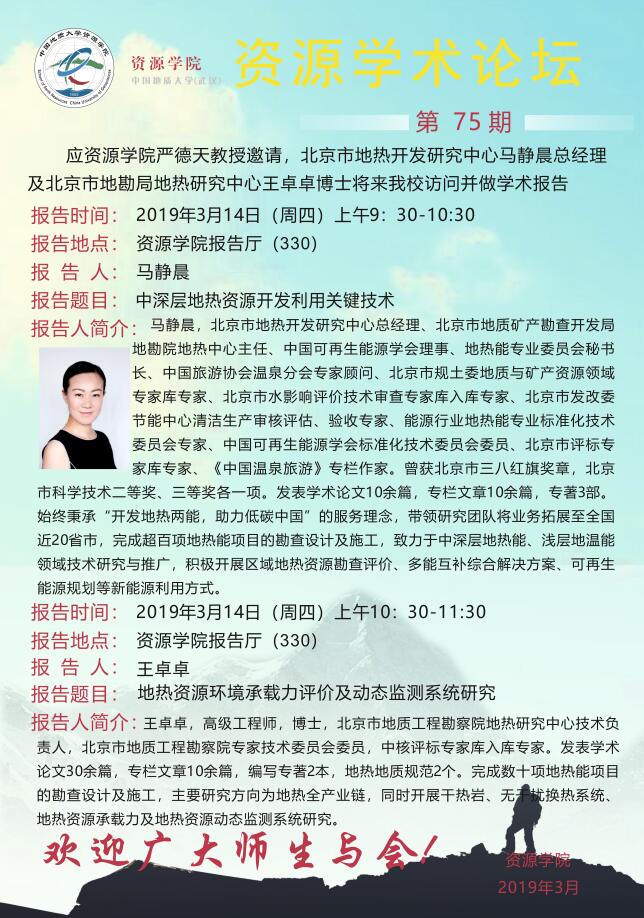 [3月14日]资源学术论坛:北京市地热开发研究中心马静晨总经理及北京市地勘局地热研究中心王卓卓博士学术报告